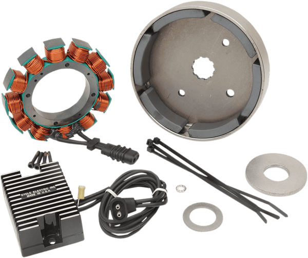 Kit includes stator, rotor, voltage regulator and mounting hardware. Available with a black Cycle Electric rectifying regulator. Made in the USA Kit includes stator, rotor, voltage regulator and mounting hardware. Available with a black Cycle Electric rectifying regulator. Made in the USA Adding electrical accessories increases amperage usage. When doing so, it is important to consider amperage ratings of switches and wires. If you draw too many amps through a switch or wire, it will heat up and may burn. Fuses and breakers are sized to protect wiring and switches. DO NOT CHANGE 30A MAIN BREAKER TO A 50A BREAKEr. THE SWITCHES AND WIRING WILL NOT BE PROTECTEd.